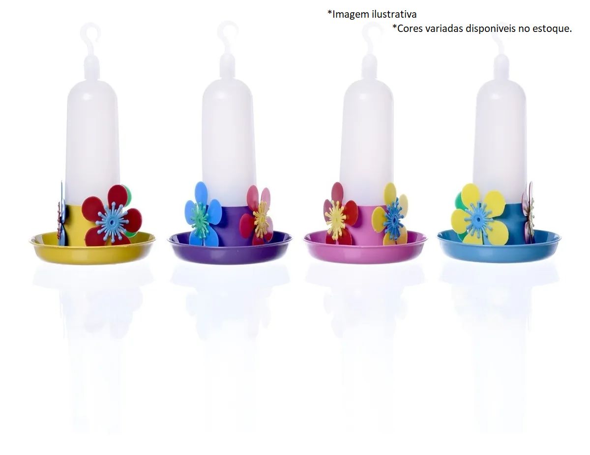 Bebedouro com 3 flores para alimentar Beija Flor e outros pássaros que se alimentam de néctar. Disponível nas cores: amarelo, roxo, rosa e azul.